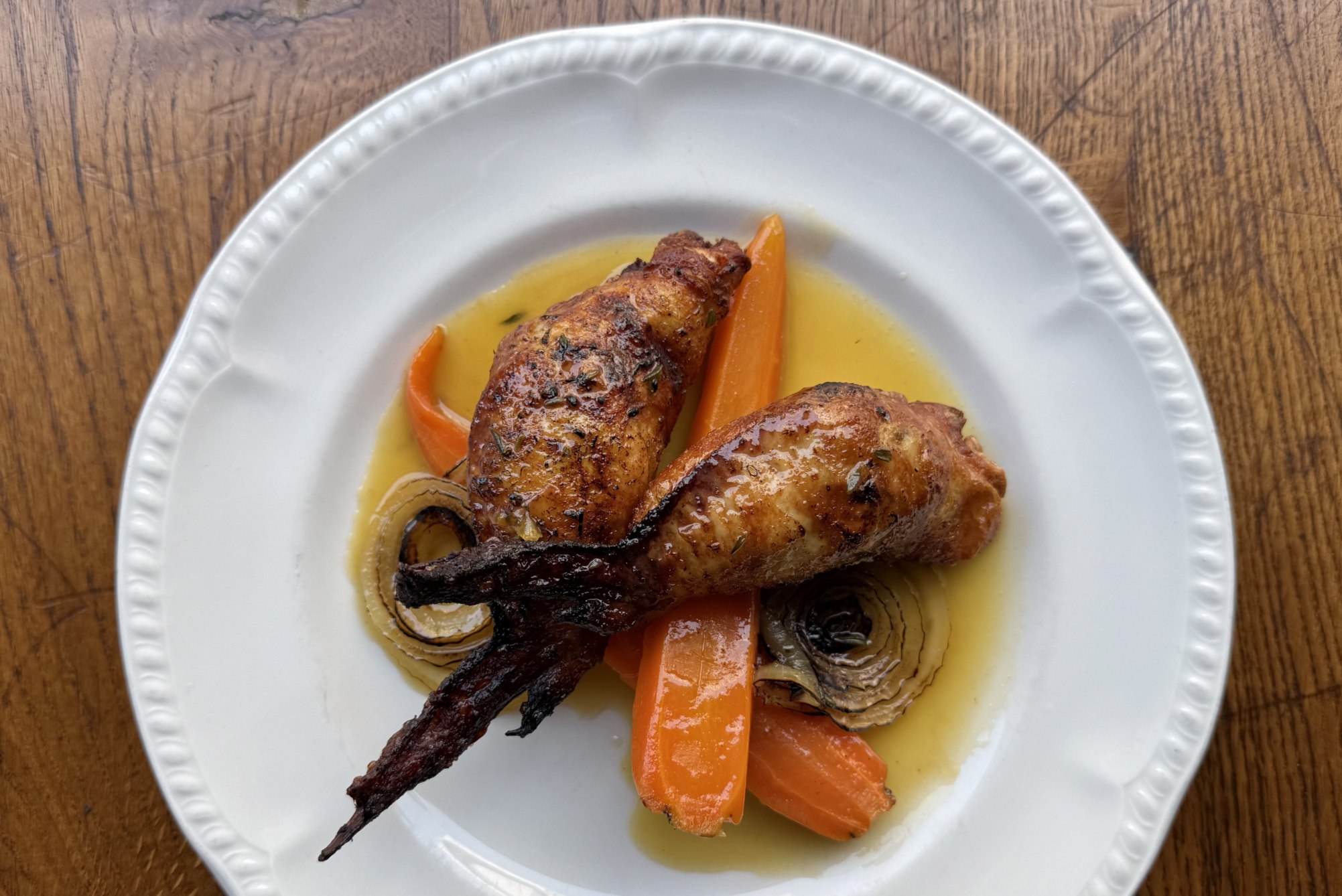 - הגשה: מכניסים את הבצל והגזר למחבת עם הרוטב המצומצם, מעבירים לצלחת ומניחים מעל את הכנפיים. מגישים עם הוינגרט לטבילה.